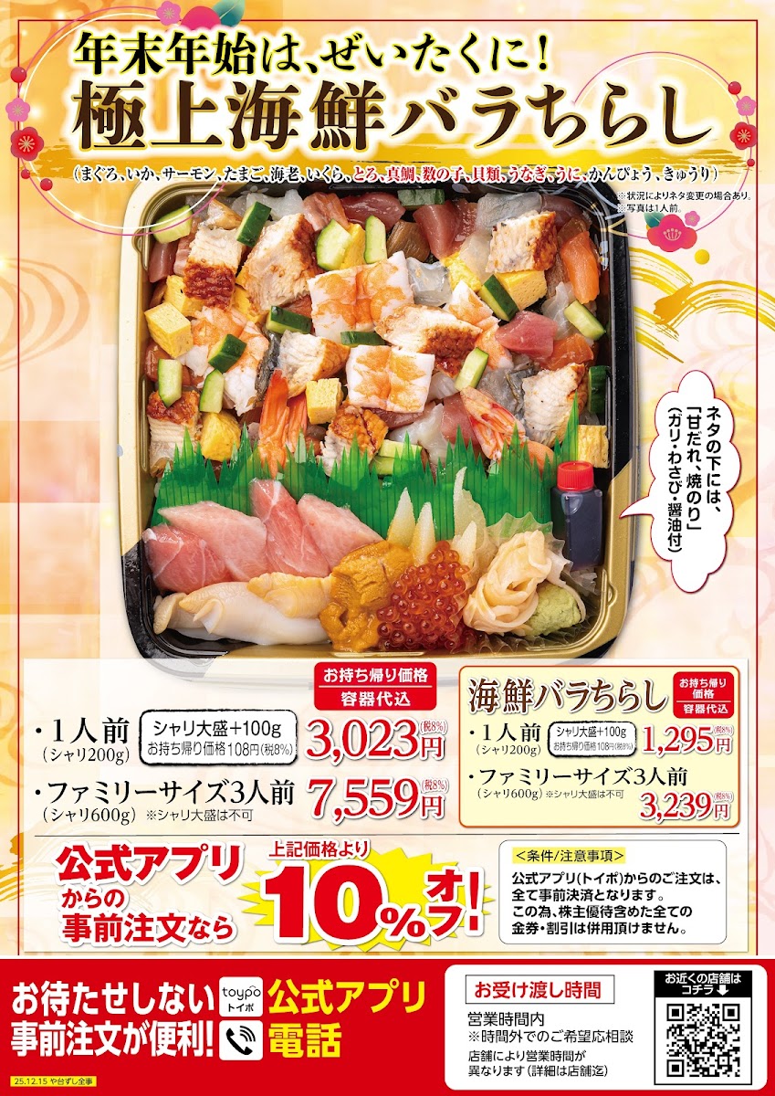 中とろ・いか・まぐろ・真鯛・数の子・穴子・貝類・はまち・海老・いくら