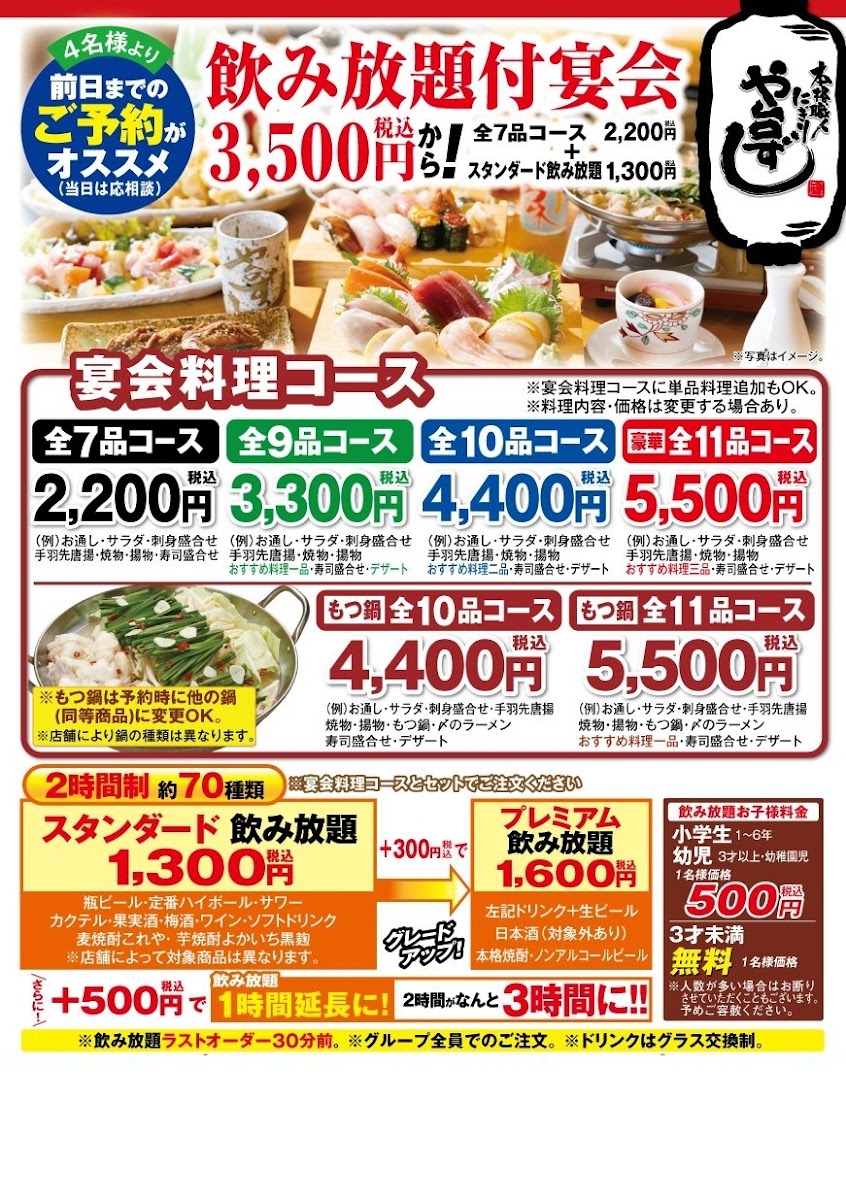 お通し・サラダ・刺身盛合せ・手羽先唐揚・焼物・揚物・おすすめ料理三品・寿司盛合せ・デザート